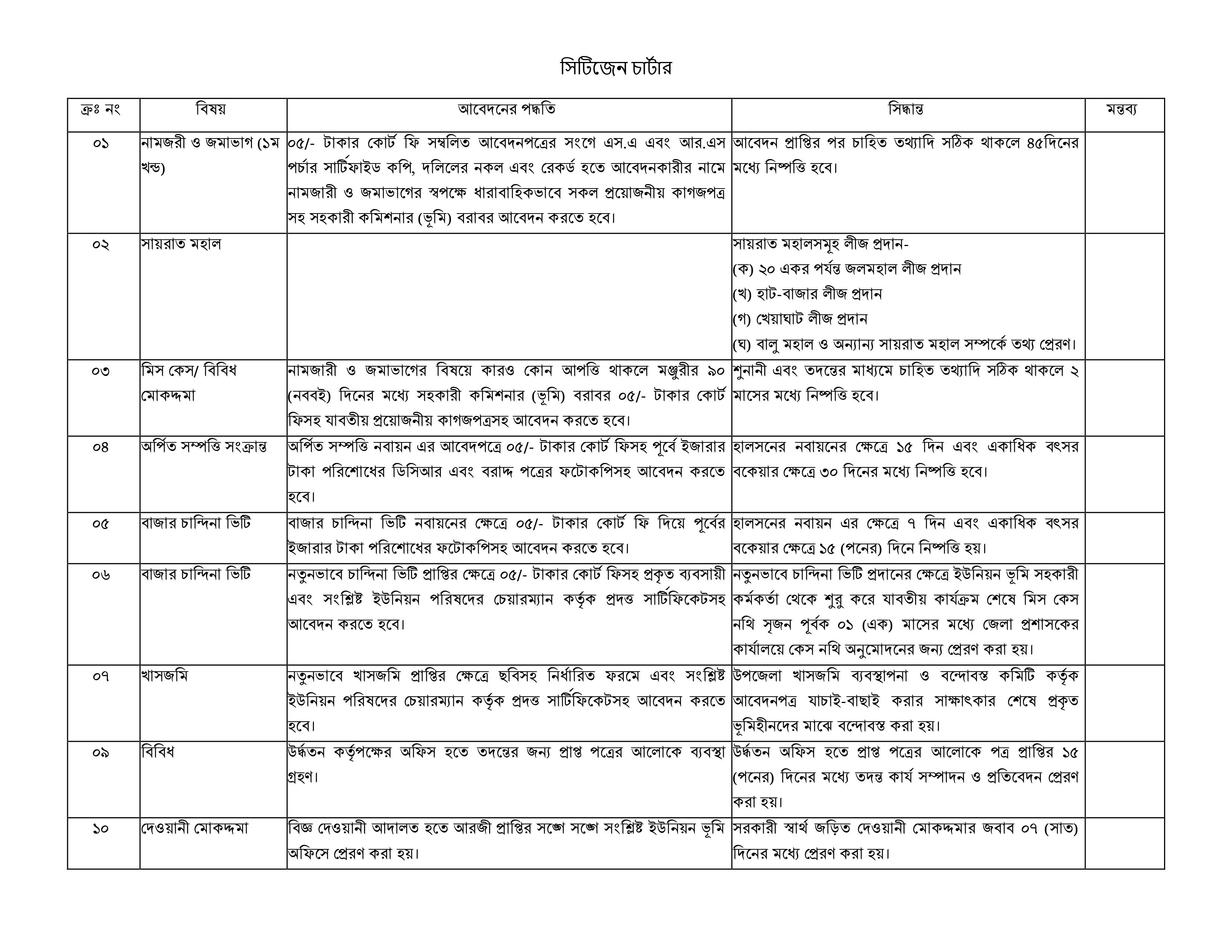 ০৩ | মিস কেস/ বিবিধ মোকদ্দমা | নামজারী ও জমাভাগের বিষয়ে কারও কোন আপত্তি থাকলে মঞ্জুরীর ৯০ (নববই) দিনের মধ্যে সহকারী কমিশনার (ভূমি) বরাবর ০৫/- টাকার কোর্ট ফিসহ যাবতীয় প্রয়োজনীয় কাগজপত্রসহ আবেদন করতে হবে। | শুনানী এবং তদন্তের মাধ্যমে চাহিত তথ্যাদি সঠিক থাকলে ২ মাসের মধ্যে নিষ্পত্তি হবে। |
